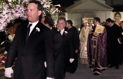 Εκατοντάδες πιστών συγκεντρώθηκαν στο ναό της Αγίας Σοφίας στο Los Angeles και φέτος, για να παρακολουθήσουν τη θεία λειτουργία της Μεγάλης Παρασκευής και την περιφορά του επιταφίου.O Tom Hanks κρατώντας τον επιτάφιο